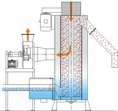 切片通過脫鹽冷卻水的輸送,經過預排水裝置進入離心干燥機。在預排水部分排除大部分輸送水量。切片通過芯軸的旋轉做離心上升運動,同時在輔助風機的作用下,風從干燥機頂部向下和切片運動形成逆流,雙重作用下脫除切片表面水份。經過干燥機的切片,表面含水率可達1000ppm以下,部分產品可達300ppm。